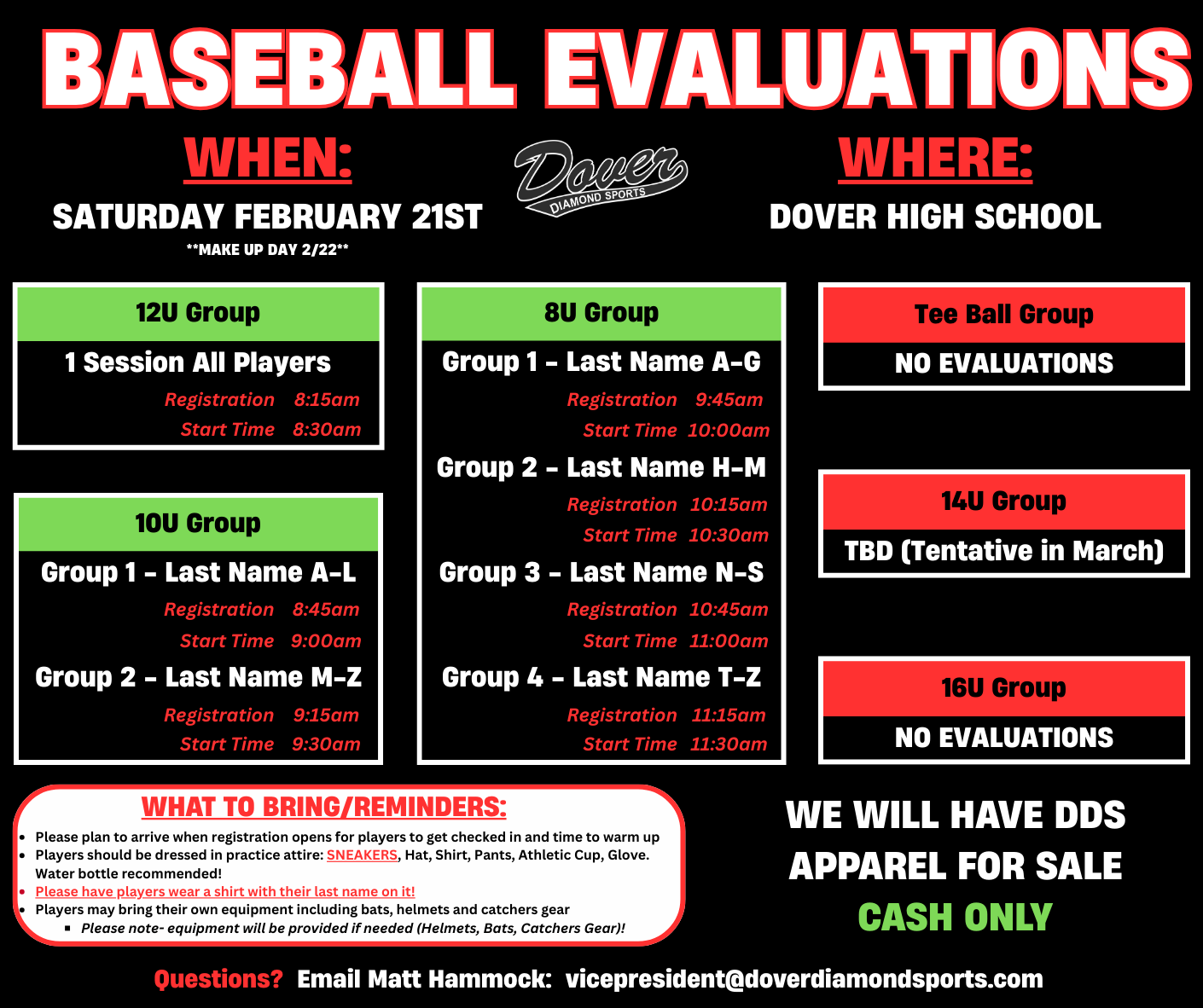 Please find Baseball and Softball evaluation schedules belowFor any Questions regarding Evaluations, please email:Baseball- Matt Hammock- [email protected]Softball- Jake Huneke - [email protected]